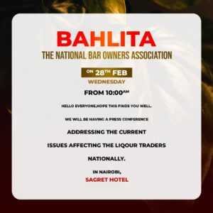 The National Bar, Hotels and Liquor Traders Association of Kenya (BAHLITA) will this week issue an official statement on the state of the sector in the country.