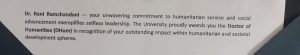 The Degree was awarded to Ramchandani for her unwavering commitment to humanitarian service and social advancement exemplifying selfless leadership.