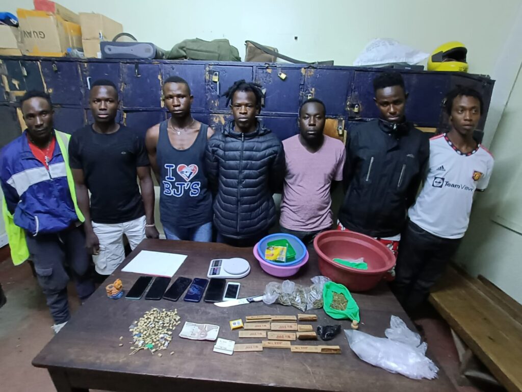 Police officers rushed to the scene and managed to arrest seven suspects; (1)Dickson Asirutwa Otieno aged 22 years for being in possession kitchen Knife,35 grams of bhang and one phone make infinix Suspected to be stolen property,13 packets of Rizlas,1 digital weighing machine,1rolling flag,1 basin maroon in colour,1 small basin pink,1 tin small green and 1 ash tray.