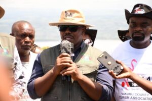 Nakuru County CECM for Trade and Tourism Stephen Kuria addressing press at Lake Nakuru National Park.PHOTO/COURTESY